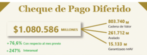 Cuando se analiza el volumen negociado en los cheques de pago diferido, se ve un incremento del 76,6% en términos mensuales y del 247% en términos interanuales.
